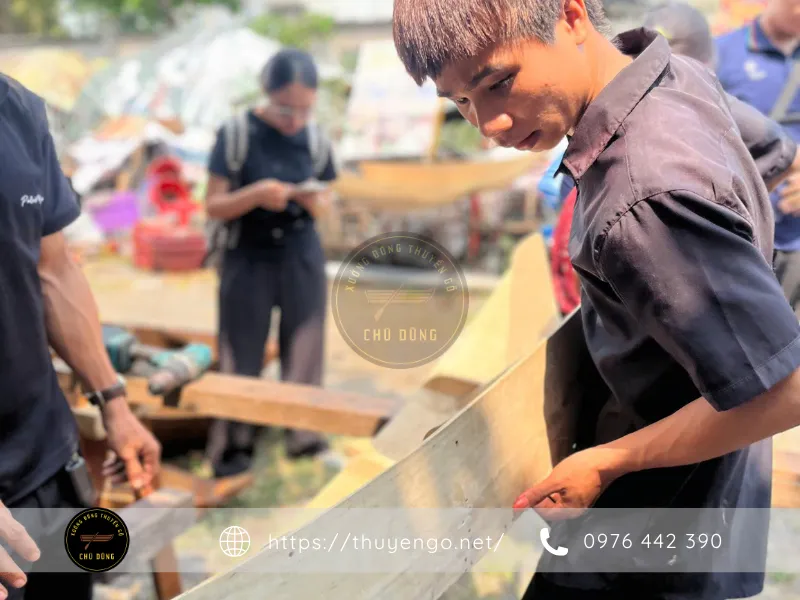 Gỗ sẽ được cắt theo khuôn thân thuyền đã thiết kế, sau đó đục lõi, tạo dáng cong hoặc vát theo đúng kiểu dáng. Thợ cần thao tác chính xác để thân thuyền có đường nét mượt, cân đối. Cuối cùng, bề mặt gỗ được mài nhẵn bằng giấy nhám, loại bỏ phần thô ráp, sẵn sàng cho bước lắp ráp và hoàn thiện.