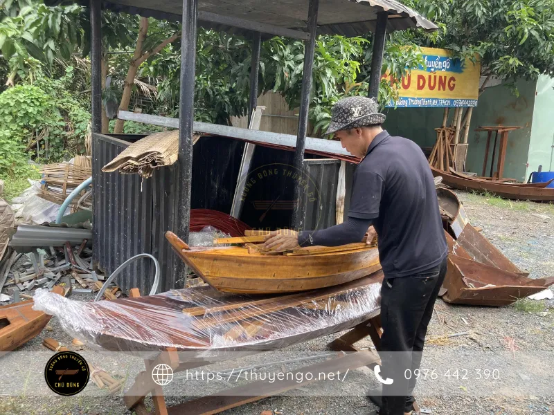 Bề mặt thuyền được sơn hoặc phủ vecni nhằm tăng độ bền, chống ẩm và tạo hiệu ứng thẩm mỹ. Tùy yêu cầu của khách, có thể trang trí thêm các chi tiết để tăng tính sinh động và chân thực.